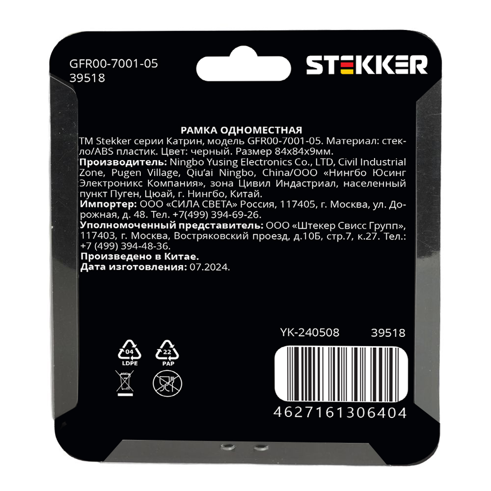 Рамка  STEKKER GFR00-7001-05 на  гнездо, , . Материал: Закаленное стекло/ABS пластик, цвет черный, размер 84*84*9мм. Номинальное напряжение , номинальный ток , диапазон рабочих температур ,